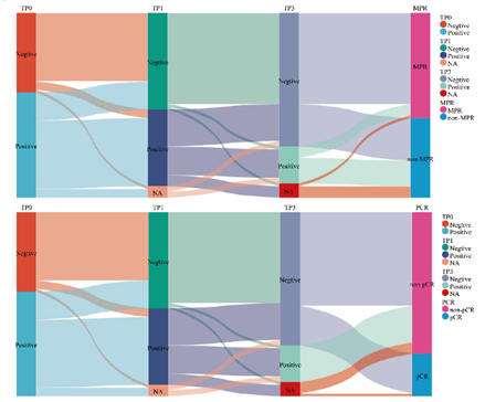 研究比较了不同时间点的ctDNA浓度和ctDNA动态变化(图6)。随着新辅助治疗的进行,未达到pCR/MPR的患者术前ctDNA浓度高于达到pCR/MPP的患者;就ctDNA动态变化而言,与未达到MPR/pCR的患者相比,MPR/pCR患者在TP2和TP3时ctDNA阳性患者百分比显著降低(图7)。